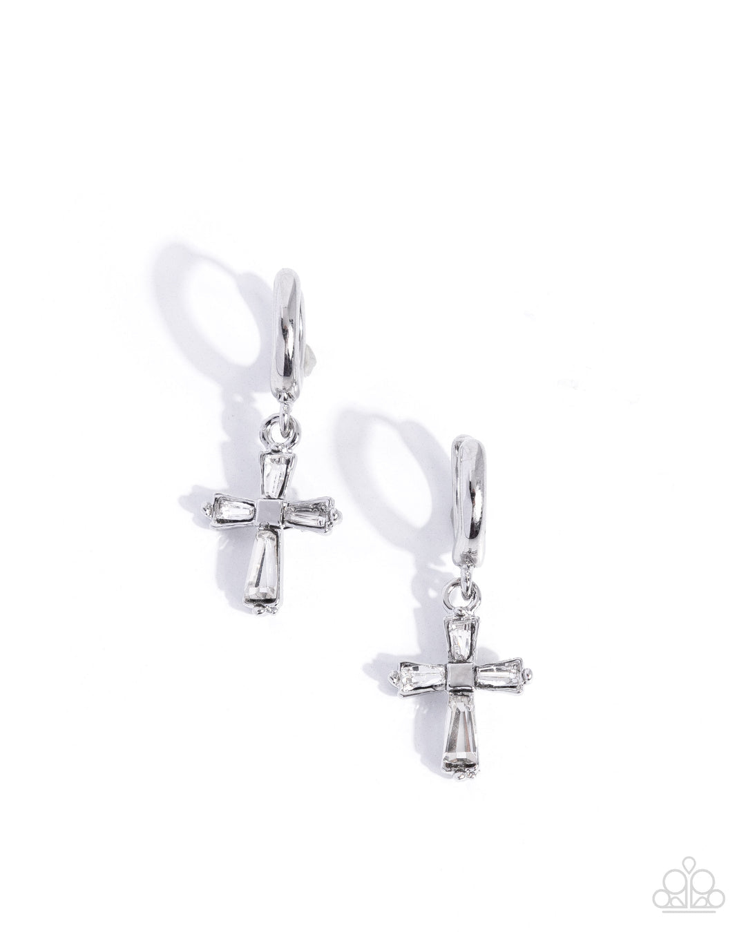 A small, skinny, silver hoop curves around the ear in a timeless fashion, showcasing a dainty silver cross made up of chiseled emerald-cut white gems that delicately sways from the center curvature of the hoop, adding a surprising hint of heavenly movement. Earring attaches to a standard hinge closure fitting. Hoop measures approximately 1/2" in diameter.