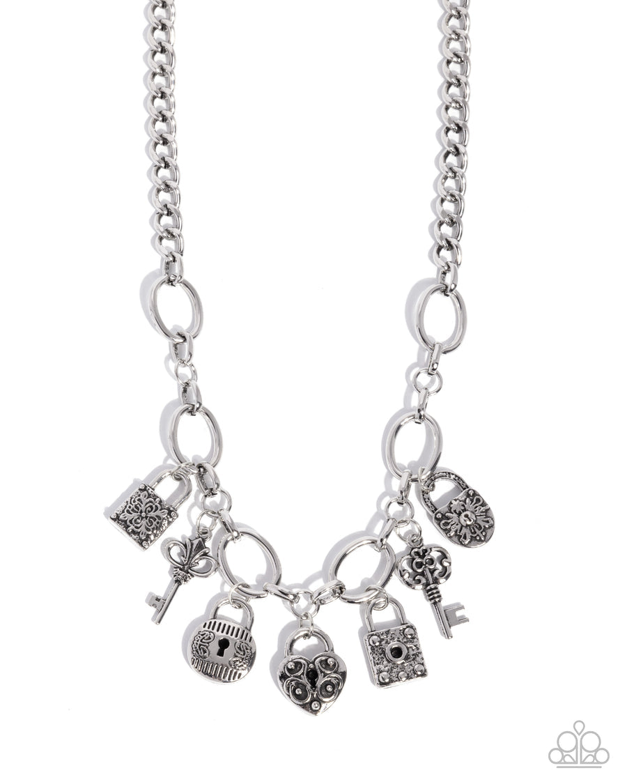 A chunky silver chain forms the base of this eclectic necklace, showcasing a playful assortment of antique-inspired charms. Interlocking rings and oversized chain links support an array of monochromatic-metal lock and key charms in silver tones. Each charm features intricate detailing, including floral engravings, filigree patterns, and textured accents, adding a vintage flair to the design. Features an adjustable clasp closure.