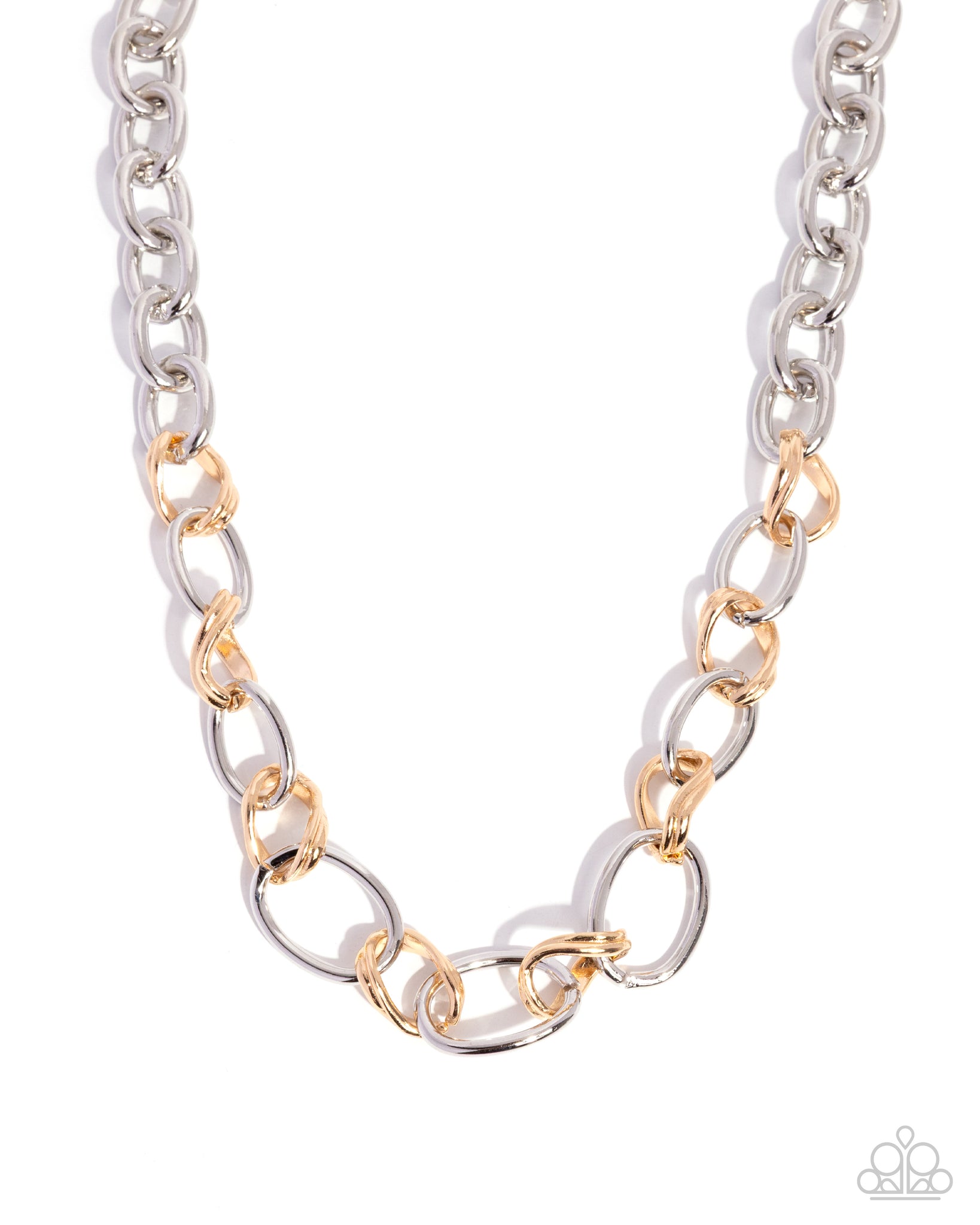 Featuring a mismatched arrangement, sections of twisted and bold gold and silver links connect across the chest, creating an intense industrial display. Features an adjustable clasp closure.